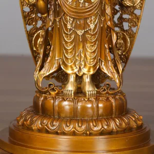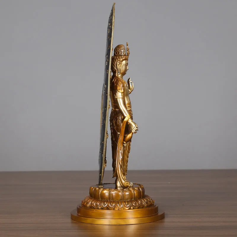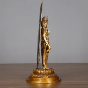 Kwan Yin Avalokitesvara Aura statue is crafted from durable brass and copper. symbolizing compassion and harmony. This statue embodies the serene presence of Kwan Yin. offering a calming influence to your space. Perfect for home desks or spiritual corners. it serves as a reminder of inner peace and balance. enriching your environment with its spiritual presence and harmonious aura.