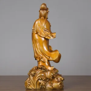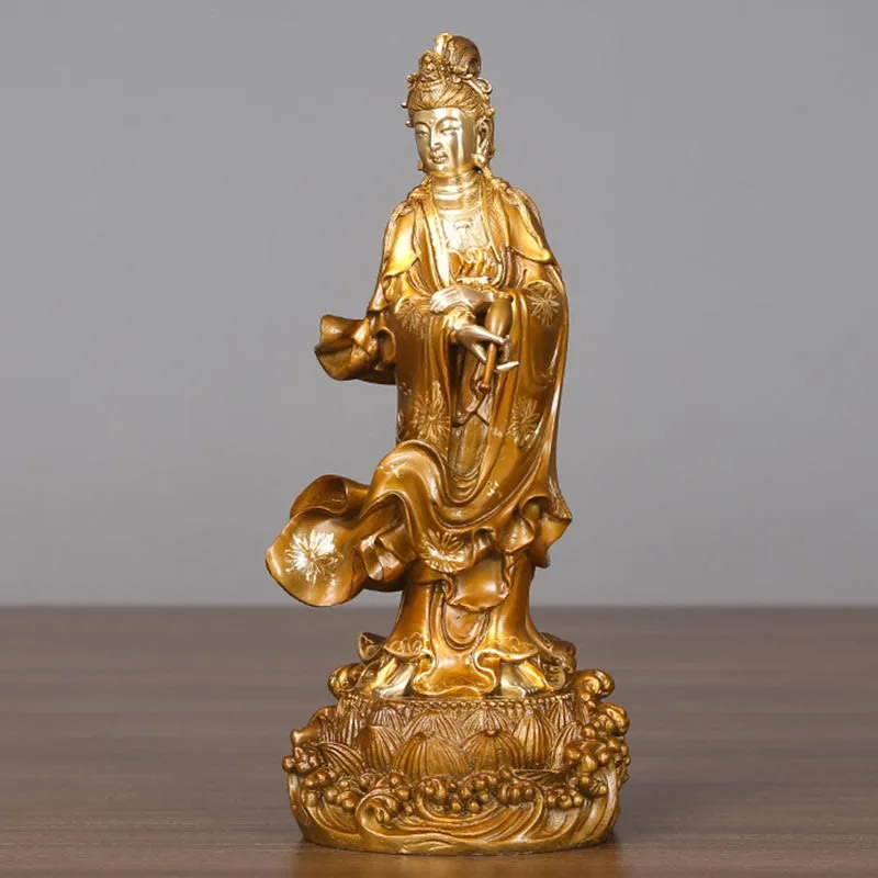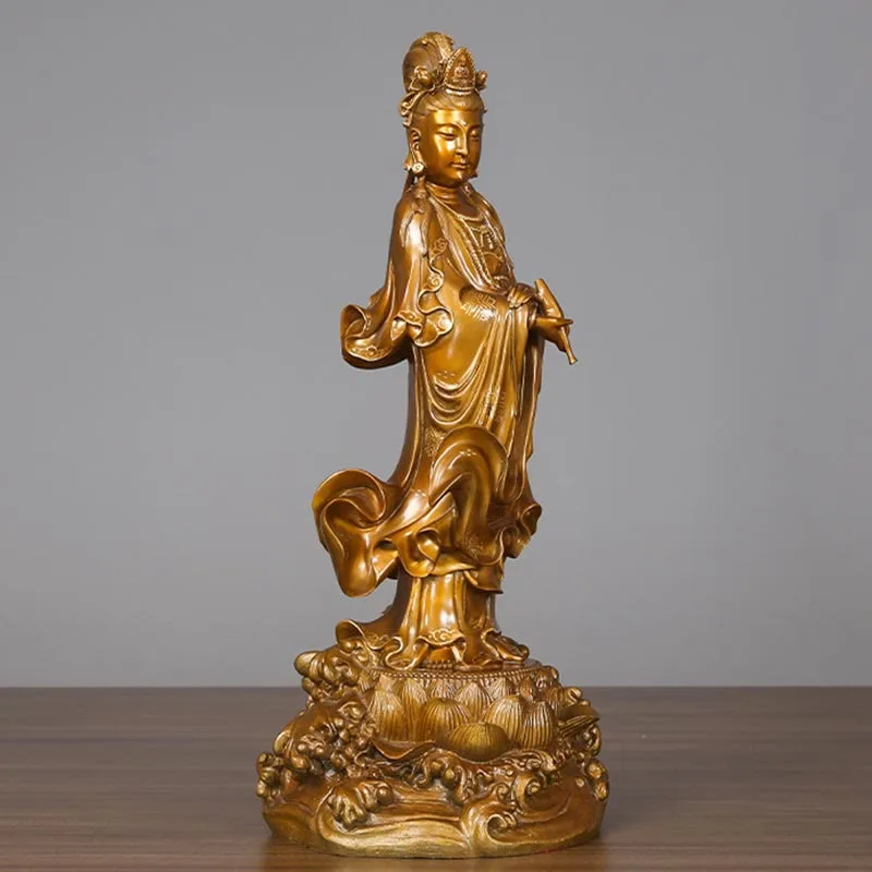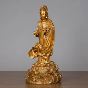 Kwan Yin Holding A Vase statue combines brass and copper to embody harmony and benevolence. The delicate vase symbolizes the nurturing of compassion and tranquility. This finely crafted statue is a perfect addition to your home. serving as a reminder of Kwan Yin’s guidance and a source of spiritual balance and peace.