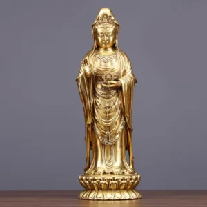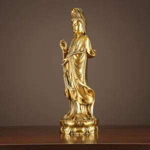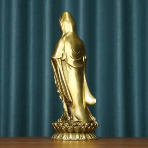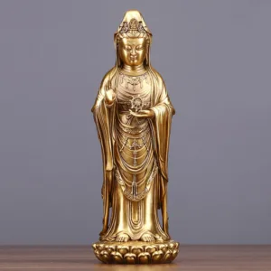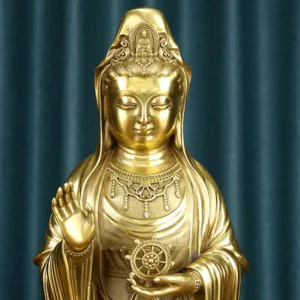 Kwan Yin Holding The Dharma Wheel Copper statue features Kwan Yin holding the Dharma Wheel. symbolizing wisdom and prosperity. Made from brass and copper. this statue embodies divine guidance and spiritual abundance. Its intricate design reflects the balance of wealth and enlightenment. making it a meaningful addition to your altar or meditation space. Perfect for inviting positive energy and wisdom into your home.
