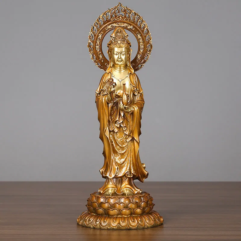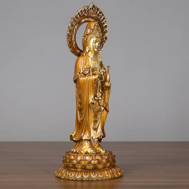 Kwan Yin Avalokitesvara Lotus statue features a harmonious blend of brass and copper. symbolizing prosperity and spiritual growth. This elegant figure captures the essence of Kwan Yin’s compassion and wisdom. making it a meaningful addition to any home. Perfect for enhancing spiritual spaces. it serves as a reminder of success and inner harmony.