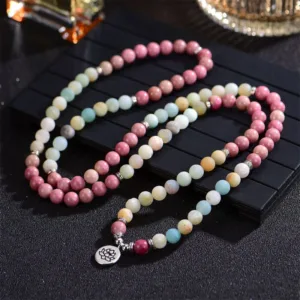The Mythstone Lazurite Picasso Jasper Amazonite Rhodonite Apatite Positive Lotus Prayer Bead Bracelet is a handmade. environmentally friendly product made by master craftsmen with high-quality natural materials. The bracelet contains Lazurite. Picasso Jasper. Amazonite. Rhodonite. and Apatite stones that offer various positive benefits such as balance. courage. healing. creativity. and enlightenment. The bracelet has 108 beads with a size of 8-8.5mm and a premium elastic string that fits a wrist circumference of 15-19cm. The Lotus symbol represents purity. rebirth. and getting through tough times.