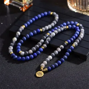 Be the first to review “Mythstone Lazurite Picasso Jasper Amazonite Rhodonite Apatite Positive Lotus Prayer Bead Bracelet”