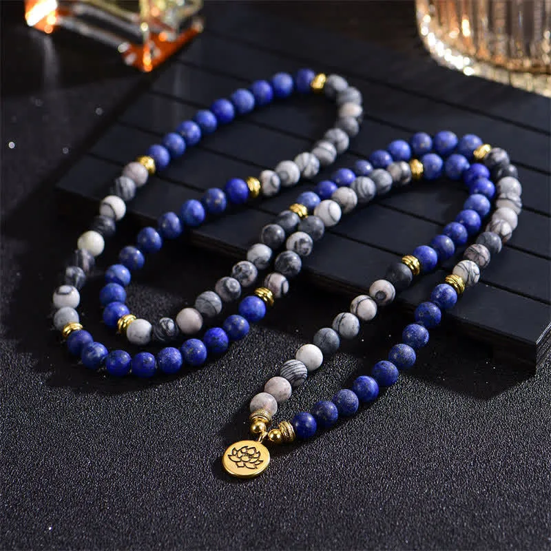 Mythstone Lazurite Picasso Jasper Amazonite Rhodonite Apatite Positive Lotus Prayer Bead Bracelet
