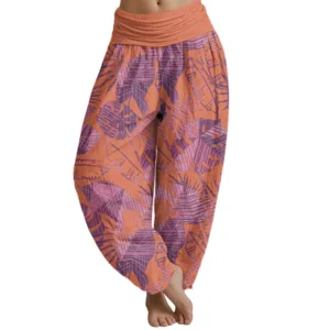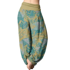 - Design: These women’s yoga harem pants feature a vibrant leaf pattern. combining a relaxed fit with a stylish design that enhances comfort and freedom of movement during practice.