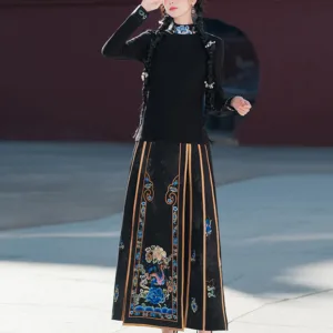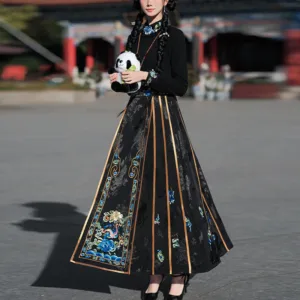 In the Qing dynasty (1644 to 1911). the mamianqun underwent a number of changes. Its embroidery patterns became much more lavish and colorful. especially on the outer skirt doors. and incorporated a wider variety of auspicious animal. insect. and flower symbols. Designs became more complicated. and some variants featured tighter and more numerous pleats. as well as sharp. contrasting trims and irregularly shaped front doors.