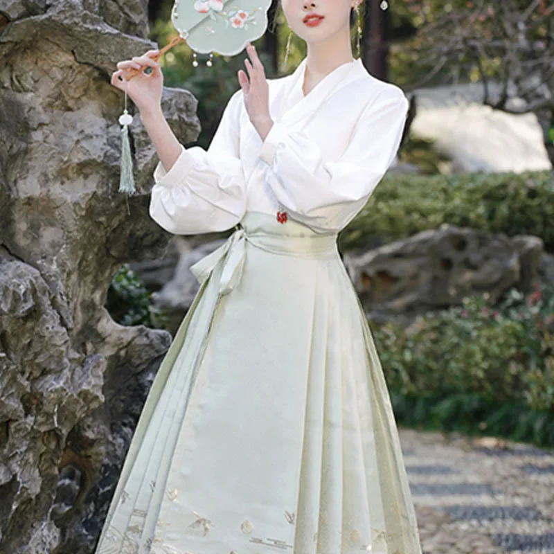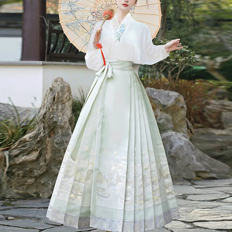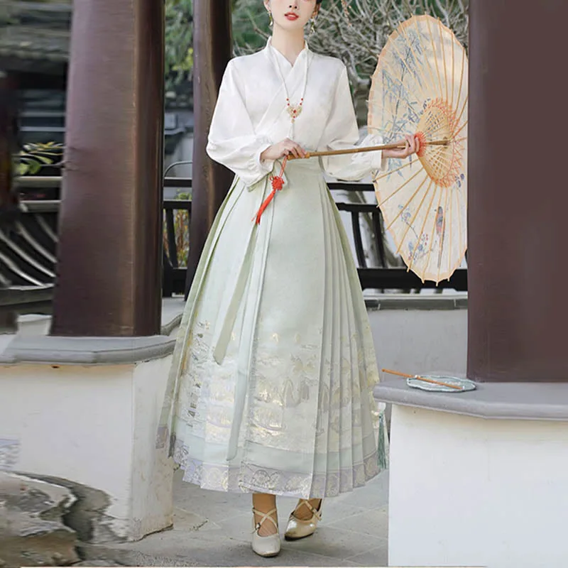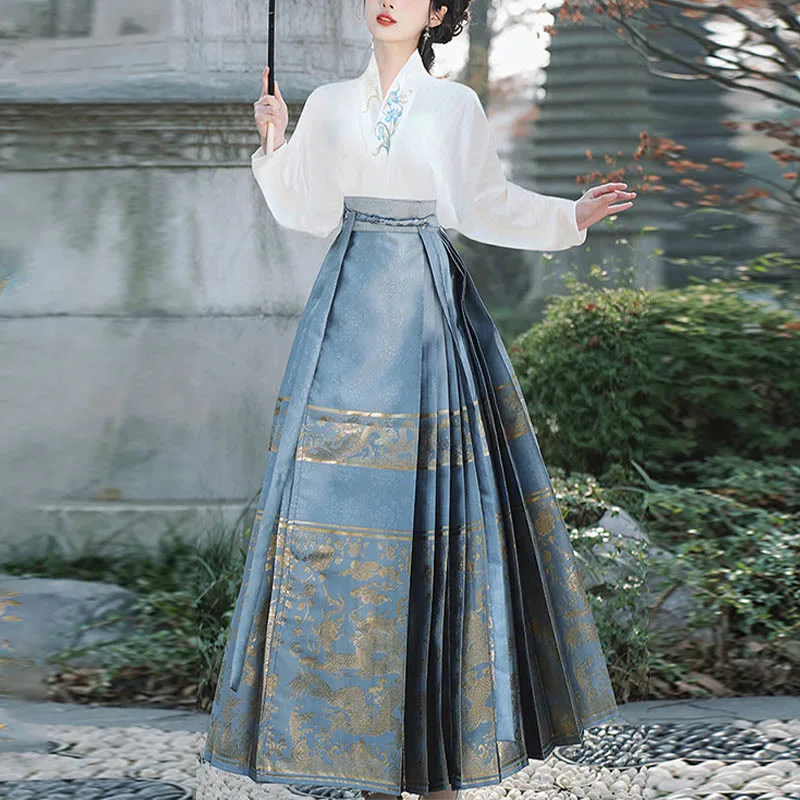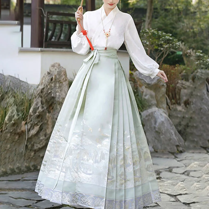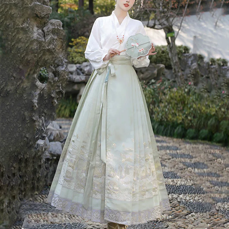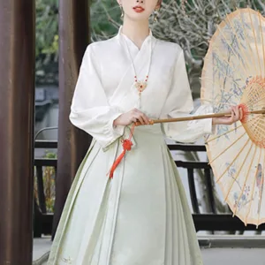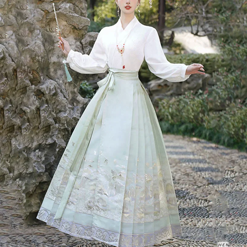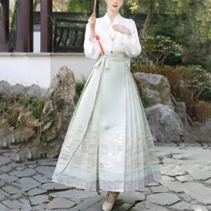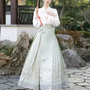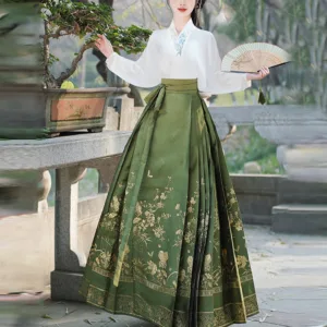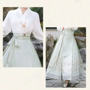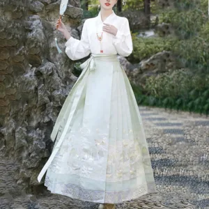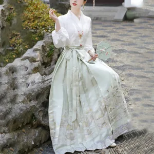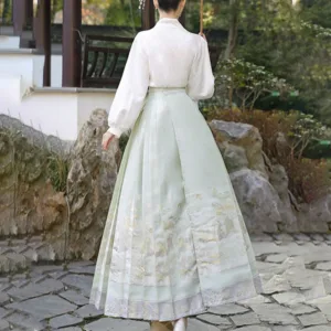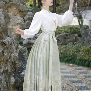 The horse face skirt is a traditional Chinese skirt characterized by its distinct pleated design. It is occasionally referred to in a more generic sense as an apron. This type of skirt is a key component of Hanfu. the traditional dress of Han Chinese women. serving as a lower garment. It is celebrated as one of the most emblematic styles of ancient Chinese skirts.