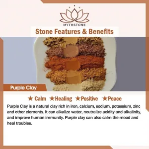 Purple Clay is a natural clay rich in iron. calcium. sodium. potassium. zinc and other elements. It can alkalize water. neutralize acidity and alkalinity. and improve human immunity. Purple clay can also calm the mood and heal troubles.