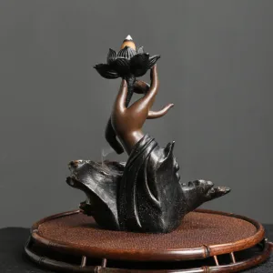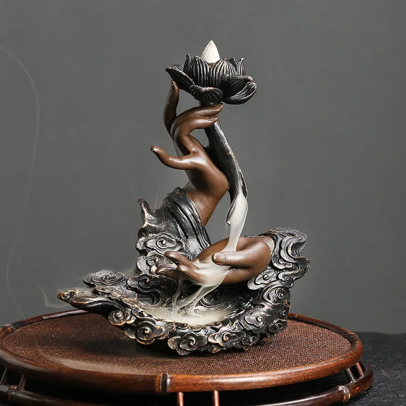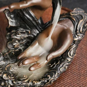 This Mythstone Lotus Buddha Hand Backflow Incense Burner. intricately crafted from resin. embodies spiritual serenity. The auspicious clouds pattern complements the flow of incense. creating a mesmerizing cascade effect. Perfect for enhancing meditation and mindfulness. it’s more than just a burner??it’s a journey to inner peace.