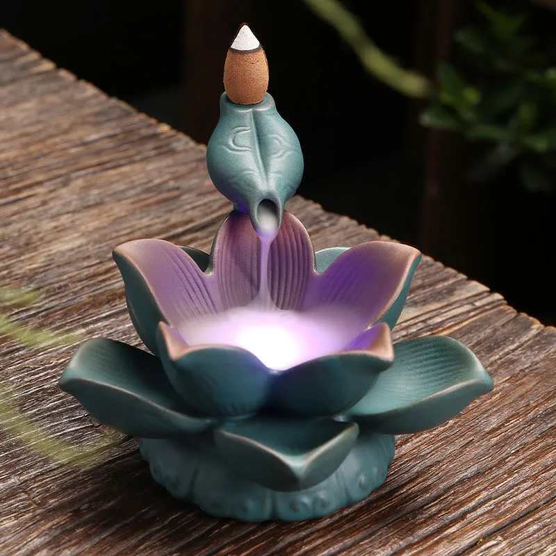 - PS: The Bottom of the Lotus Flower Incense Burner has a switch to open the led light. Led lights run on battery power.