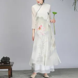 Mythstone Lotus Flower Pod Chiffon Cheongsam Midi Dress Meditation Zen Practice Clothing