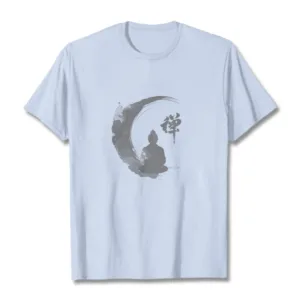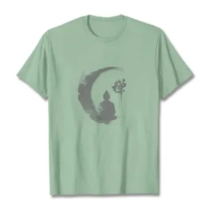 - DESIGN INSPIRATION: The design of this meditative Buddha silhouette is set against an abstract backdrop resembling a crescent moon. emphasizing tranquility and introspection. with the surrounding elements suggesting movement and fluidity. Chinese “??” means “Zen”. which refers to a quiet and peaceful state of mind. maintaining a calm heart in a busy life. Wearing this T-Shirt embodies the simple life attitude and attention to the inner world.