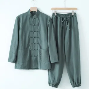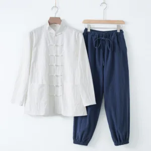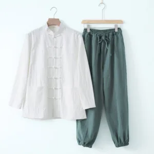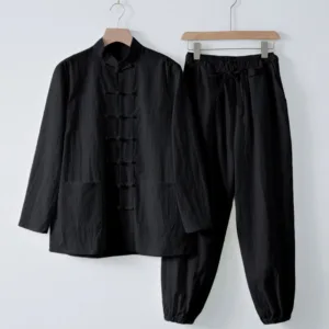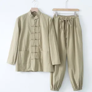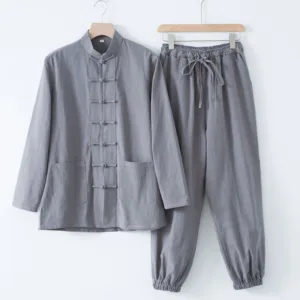 Tang Long Sleeve Frog-Button Clothes are crafted from soft. breathable fabric designed for comfort during meditation or relaxation. The unique frog-button design adds a touch of traditional elegance while providing ease of wear. This two-piece suit features a long sleeve shirt and pants. allowing for unrestricted movement and tranquility. Ideal for both meditative practices and leisure time. these clothes promote a sense of peace and connection with oneself.