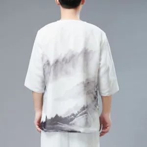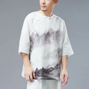 Men’s Frog-Button Mountain Landscape shirt features a unique ink painting design of serene mountain landscapes. The half sleeve shirt. adorned with traditional frog buttons. combines artistic elegance with cultural heritage. Crafted from lightweight fabric. it offers both comfort and style. making it a perfect choice for those who appreciate artistic expression and traditional craftsmanship.