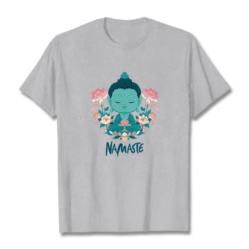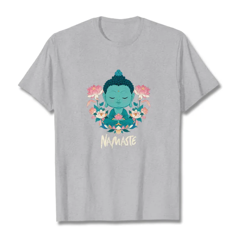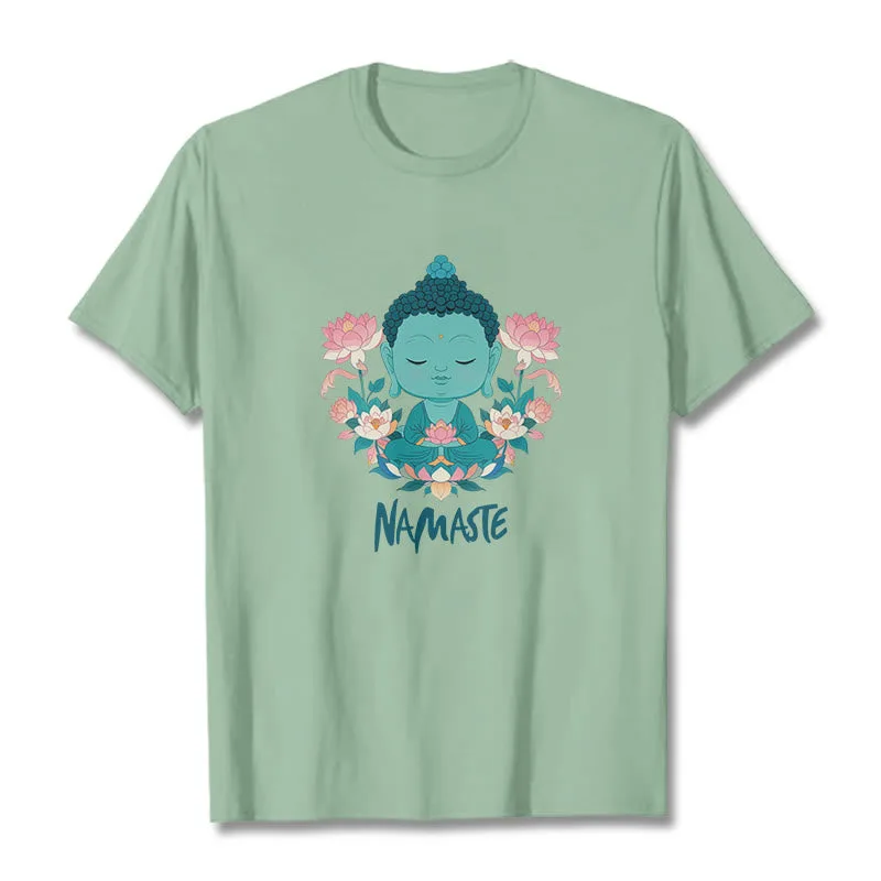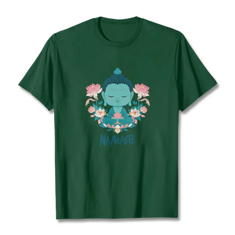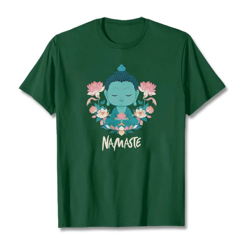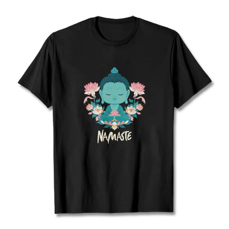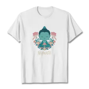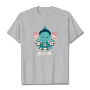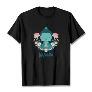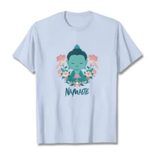 NAMASTE Buddha Lotus Meditation Tee T-shirt exudes tranquility and mindfulness. Crafted from soft. breathable fabric. this tee features a serene Buddha and lotus design with the word “NAMASTE.” It reminds you to honor yourself and others. fostering a peaceful. meditative state. Ideal for yoga. meditation. or everyday wear. it encourages a calm and centered lifestyle.