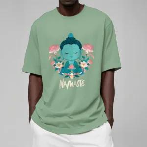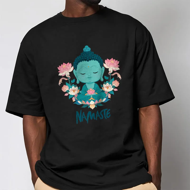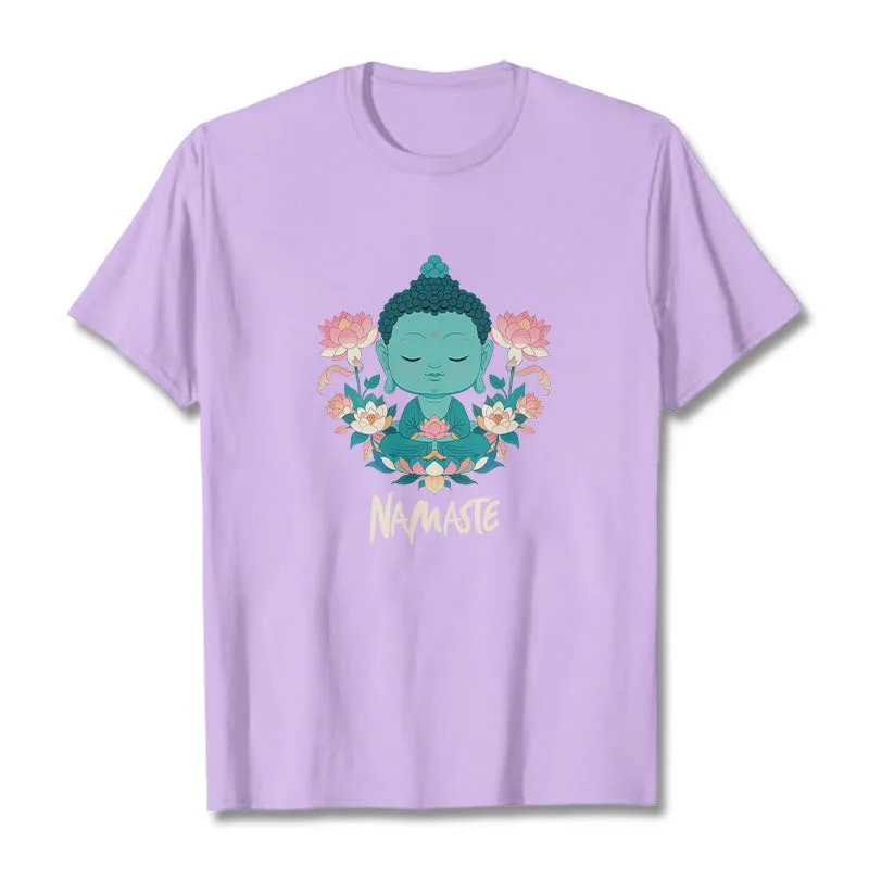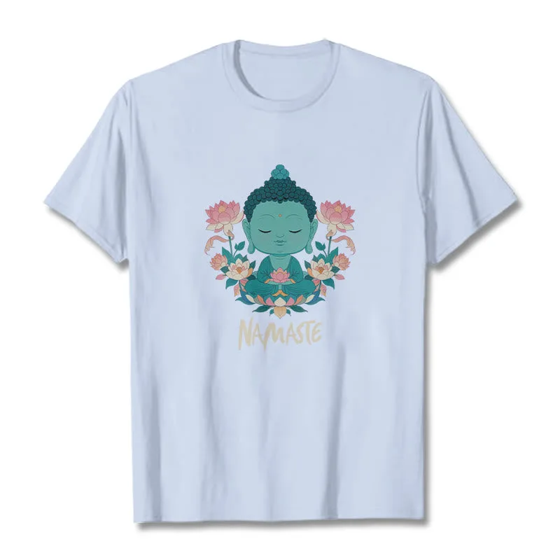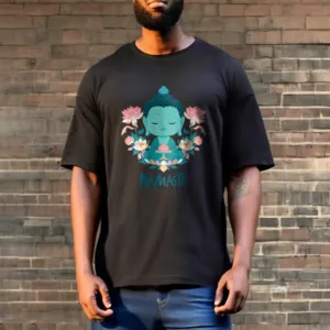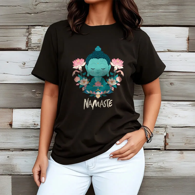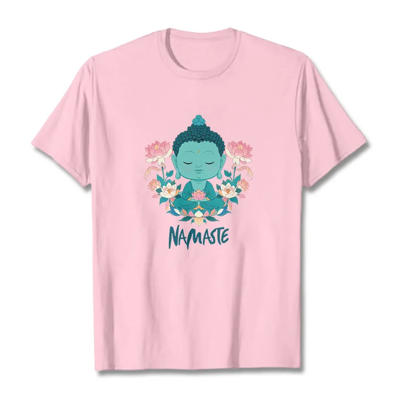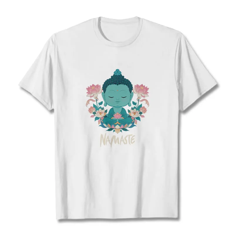 NAMASTE Buddha Lotus Meditation Tee T-shirt exudes tranquility and mindfulness. Crafted from soft. breathable fabric. this tee features a serene Buddha and lotus design with the word “NAMASTE.” It reminds you to honor yourself and others. fostering a peaceful. meditative state. Ideal for yoga. meditation. or everyday wear. it encourages a calm and centered lifestyle.