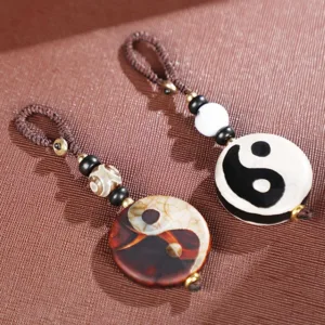 - Material: Dzi Bead. Agate. Coconut Buckle. Brass. Wood. Rope