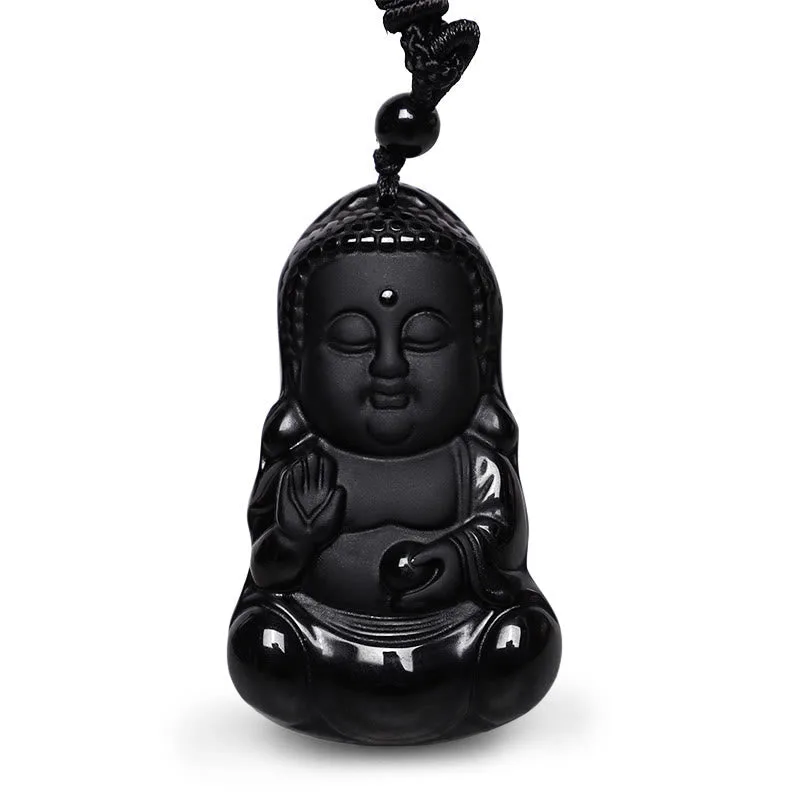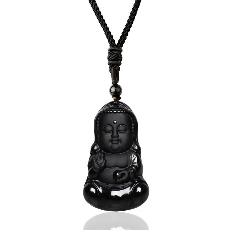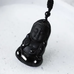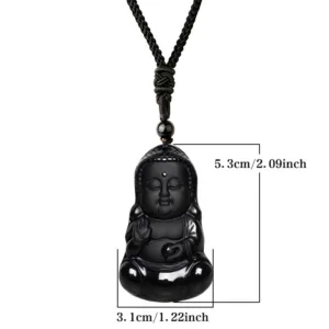 Natural Black Obsidian Crystal Buddha Strength Protection Amulet Lucky Charm Pendant Necklace is a necklace made with a black Obsidian crystal pendant carved in the shape of a Buddha. It is believed to provide strength. protection. and good luck to the wearer. The necklace is worn as an amulet or lucky charm and is typically used for meditation. healing. and spiritual purposes.