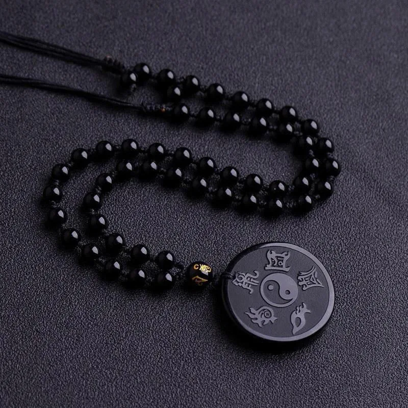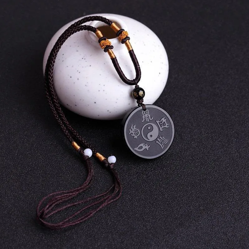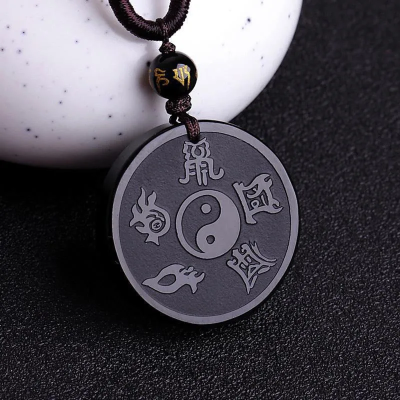 Mythstone Natural Black Obsidian Taoism Five Sacred Mountains Nine-Character Mantra Carved Strength Yin Yang Necklace Pendant Key Chain