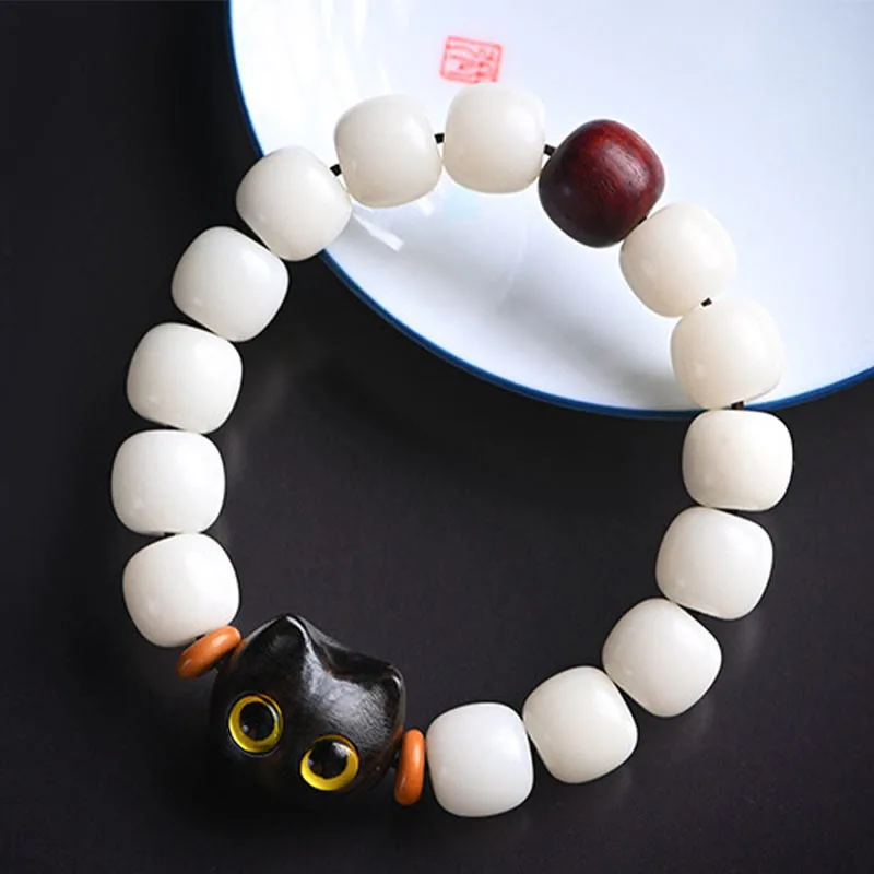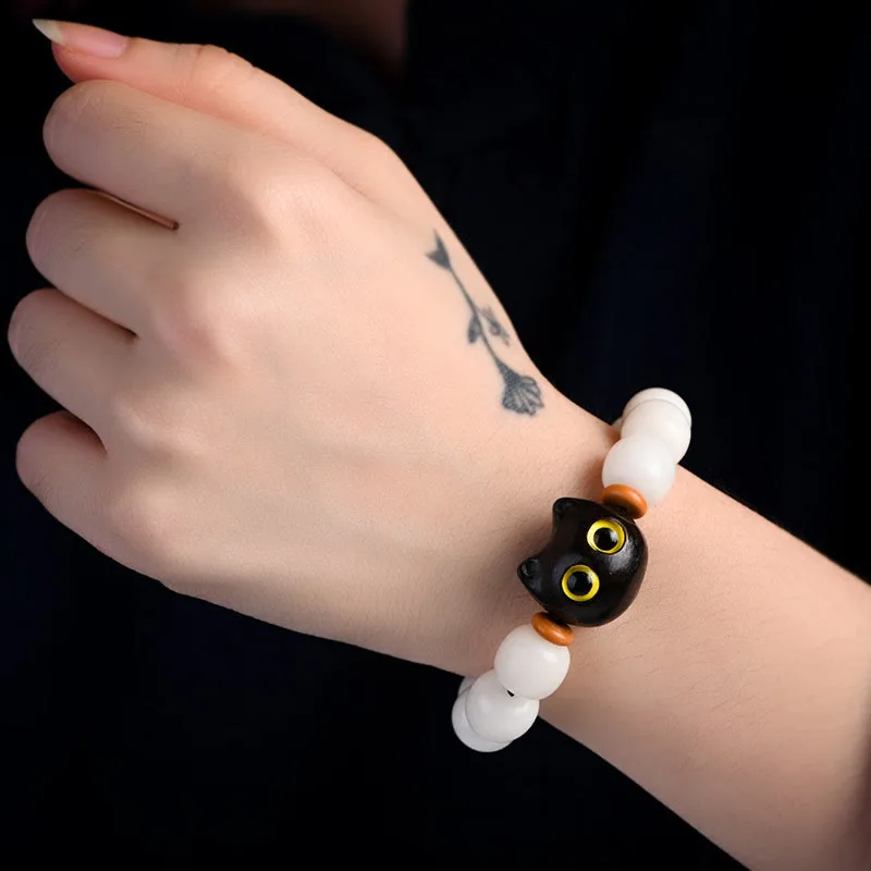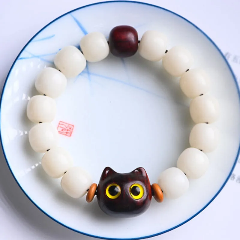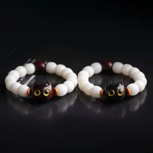 Mythstone Lucky Cat Wisdom Bracelet combines the serene energies of natural Bodhi seed. small leaf red sandalwood. and ebony wood. featuring a charming lucky cat design. This bracelet is a symbol of wisdom and fortune. designed to bring its wearer the peaceful vibrations of nature along with a touch of whimsy. The cute lucky cat motif serves as a gentle reminder to embrace curiosity and intelligence on one’s spiritual journey.