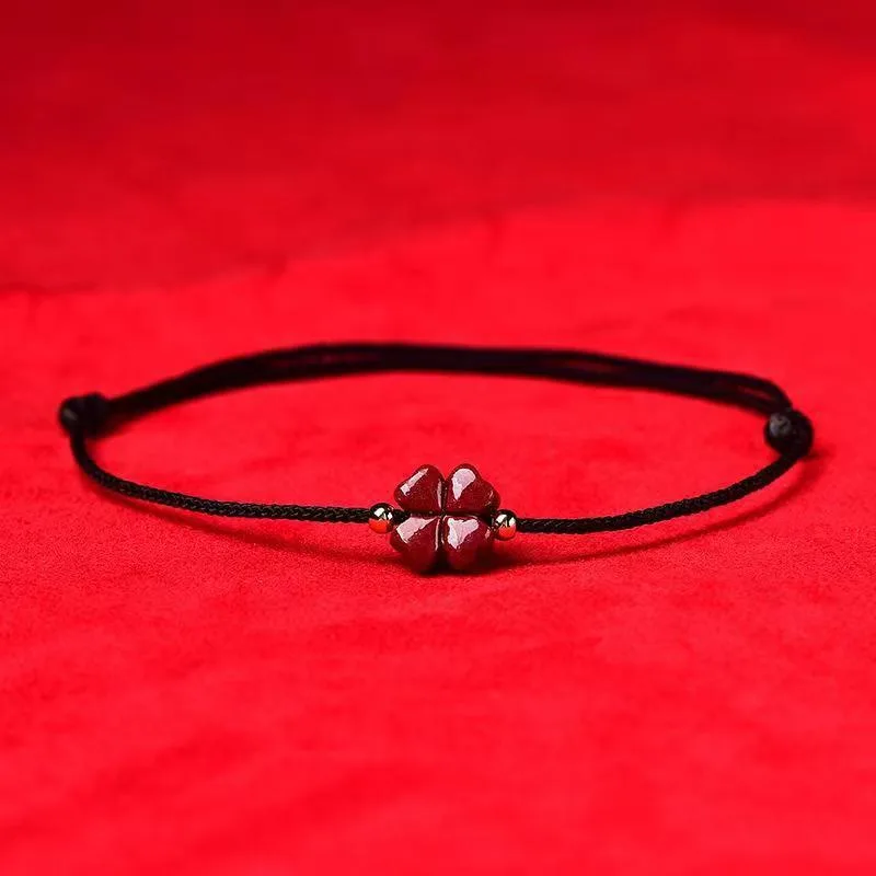 The Natural Cinnabar Four Leaf Clover Blessing Red String Bracelet Anklet is a beautiful and versatile accessory that can be worn as both a bracelet and an anklet. It is made of red string. which is believed to bring good luck and positive energy in Chinese culture. with a stunning cinnabar Four Leaf Clover charm for added blessings.Add a touch of luck and charm to your wardrobe with the Cinnabar Four Leaf Clover Blessing Red String Bracelet Anklet today!