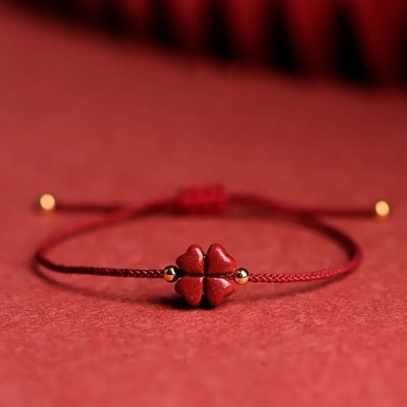 Mythstone Natural Cinnabar Four Leaf Clover Blessing Red String Bracelet Anklet
