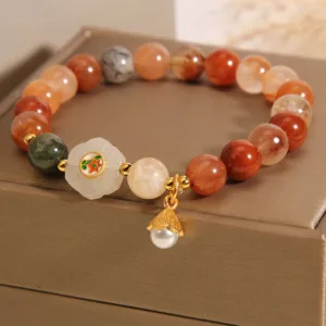 Fu Lu Shou Crystal Bracelet features a stunning flower-shaped white jade ornament complemented by a delicate pearl pendant. This bracelet incorporates Fu Lu Shou crystal. a combination of vibrant rutilated quartz in red. yellow. and green. symbolizing happiness. auspiciousness. and longevity. Each element is thoughtfully chosen to promote well-being and positive energy. making it a meaningful accessory for attracting good fortune and joy.