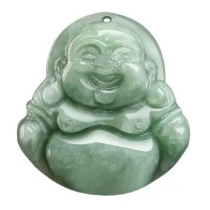 This natural green jade Laughing Buddha pendant embodies luck and abundance. Its serene design appeals to those seeking positive energy and prosperity. Wear it to attract good fortune and infuse your life with a sense of joy and contentment.