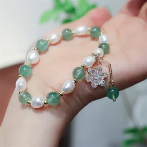 Mythstone Natural Green Strawberry Quartz Pearl Flower Charm Love Bracelet