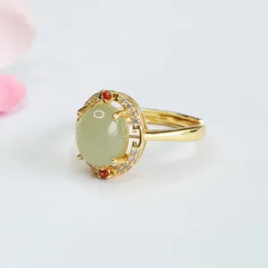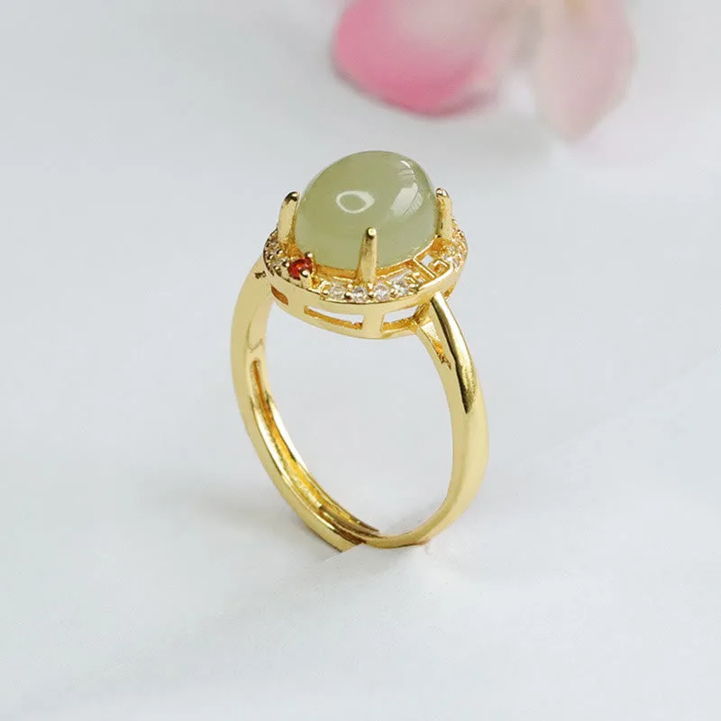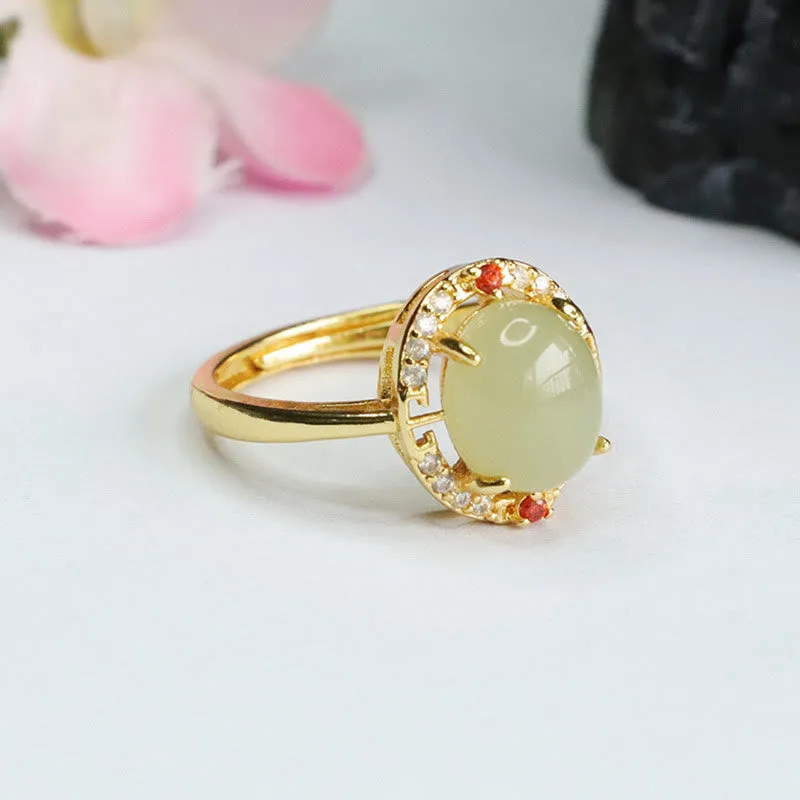 Mythstone Natural Hetian Jade Zirconia Egg Copper Open Luck Ring