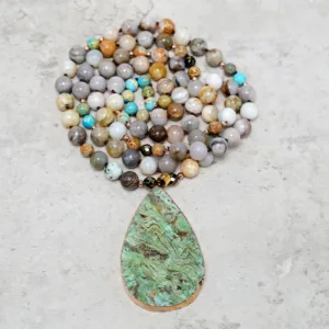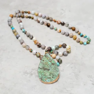 The Mythstone Natural Ocean Picasso Jasper Beaded Healing Necklace is handmade with selected high-quality materials. The Picasso jasper stone is a protective and energizing stone that brings courage to face unpleasant tasks and rectify unjust situations. The necklace is 33.5 inches long and suitable for both men and women.