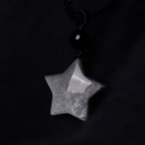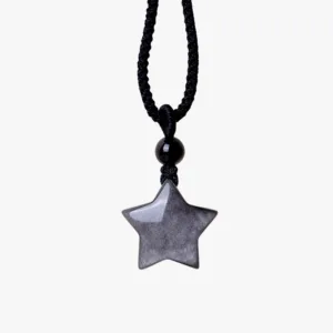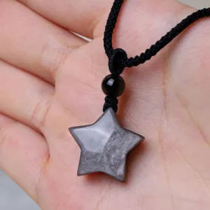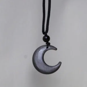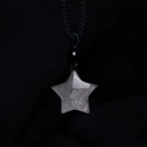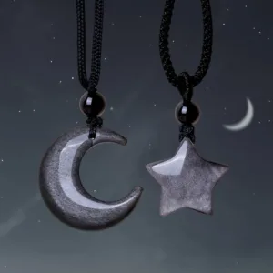 Infuse your aura with the celestial energy of the star and crescent moon design in the Mythstone Necklace Pendant. Crafted from Silver Sheen Obsidian. it’s not just an accessory; it’s a conduit for clear communication and protection. Let the soothing properties of Obsidian guide you. while the symbolic elements elevate your spiritual journey.