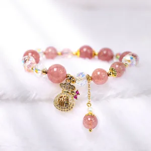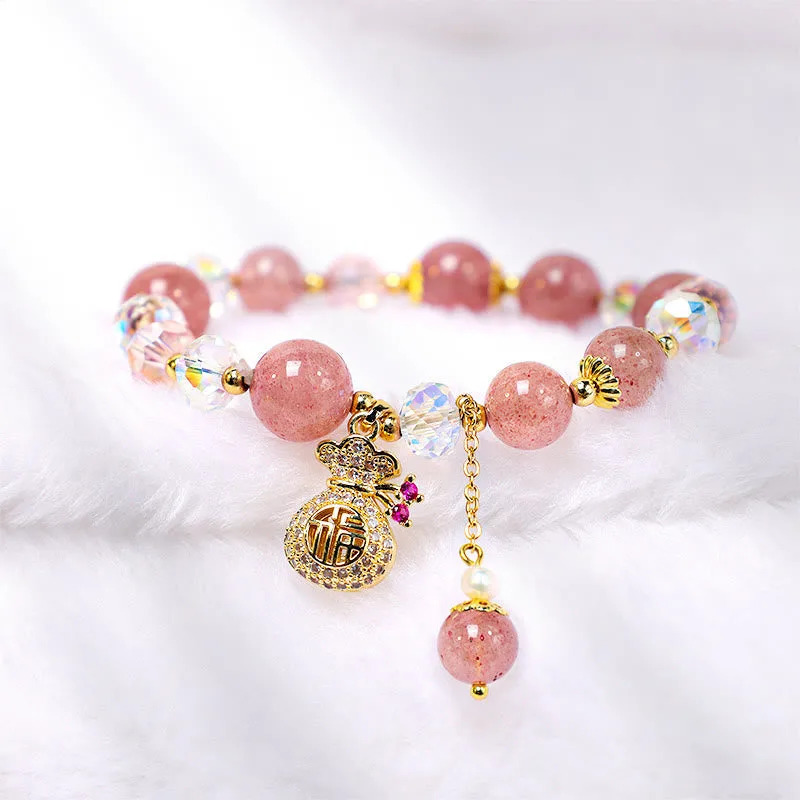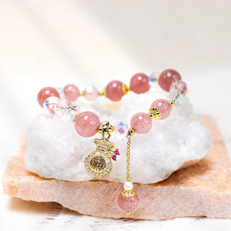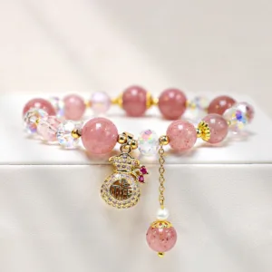 TheNatural Strawberry Quartz Crystal Money Bag Charm Positive Braceletis a piece of jewelry that features a combination of strawberry quartz crystals and a money bag charm. It is believed to attract wealth and prosperity. while also promoting positive energy and emotional balance.