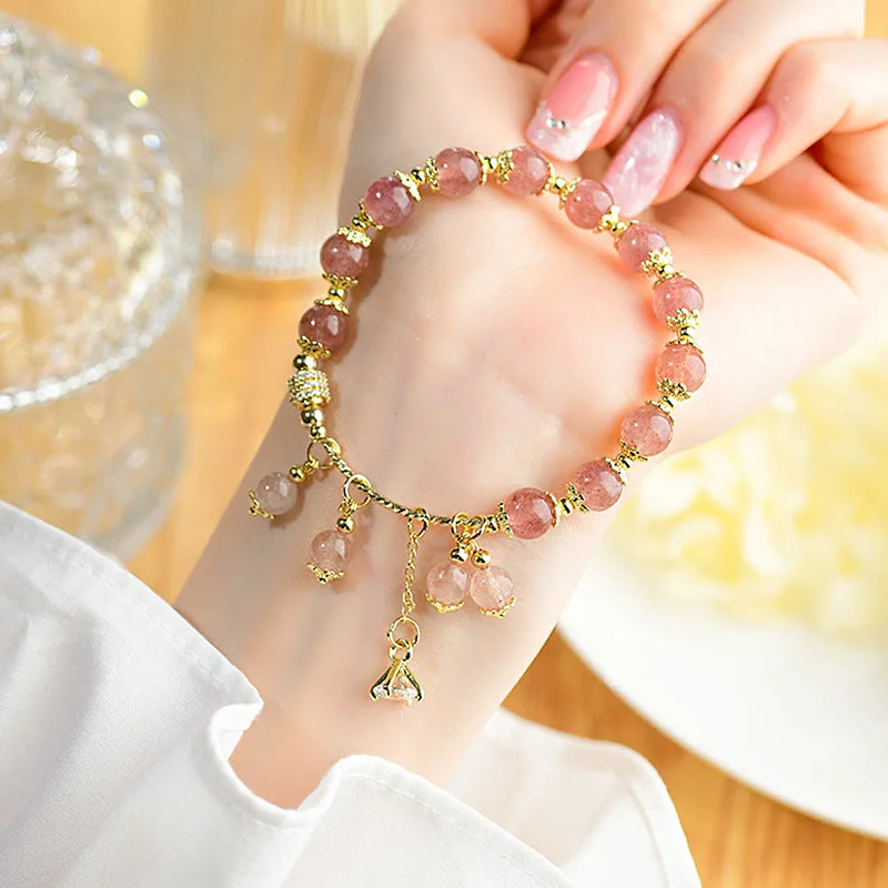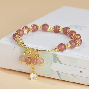 Strawberry Quartz Healing Bracelet combines natural Strawberry Quartz and sparkling Zircon accents for a serene and uplifting look. Each Strawberry Quartz bead. separated by gold-toned spacers. promotes inner peace and self-love. The center pendant with delicate Zircon stones adds a touch of elegance and brings harmony. creating a bracelet that inspires positivity and balance in daily life.