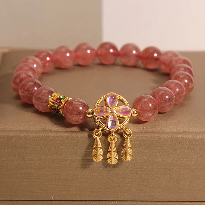 Strawberry Quartz Love bracelet features a four-leaf clover and a dreamcatcher charm. symbolizing luck and protection in love. Crafted with natural strawberry quartz. this bracelet is intended to attract positive emotional energy and foster loving connections. It’s perfect for those seeking to enhance their romantic relationships or to cherish and protect their existing emotional bonds.