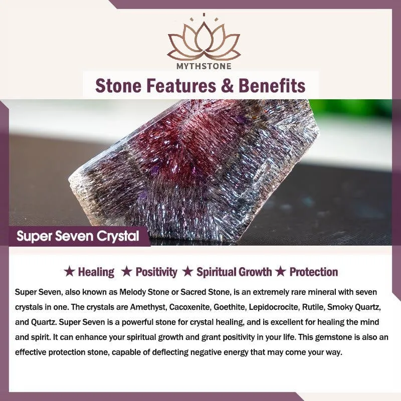 Super Seven. also known as Melody Stone or Sacred Stone. is an extremely rare mineral with seven crystals in one. The crystals are Amethyst. Cacoxenite. Goethite. Lepidocrocite. Rutile. Smoky Quartz. and Quartz. Super Seven is a powerful stone for crystal healing. and is excellent for healing the mind and spirit. It can enhance your spiritual growth and grant positivity in your life. This gemstone is also an effective protection stone. capable of deflecting negative energy that may come your way.