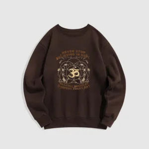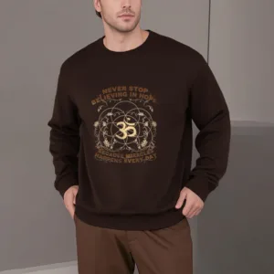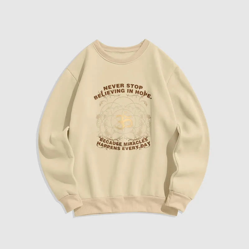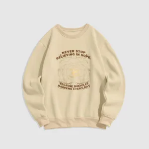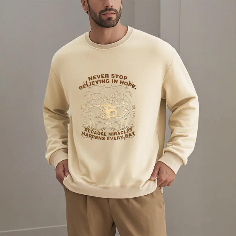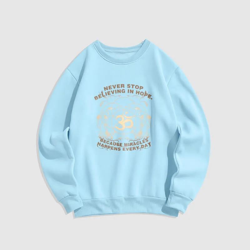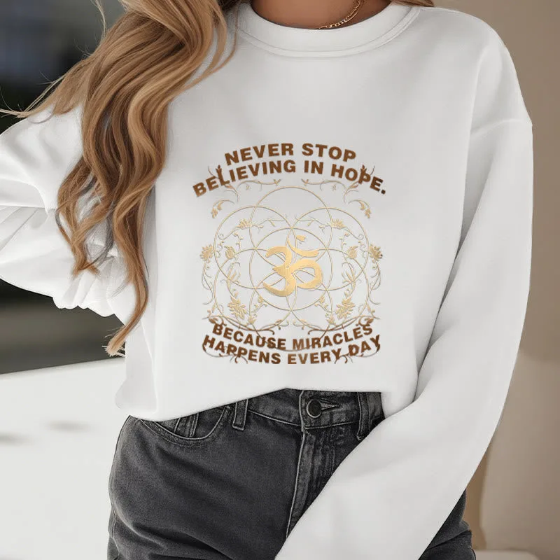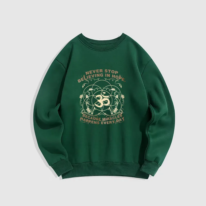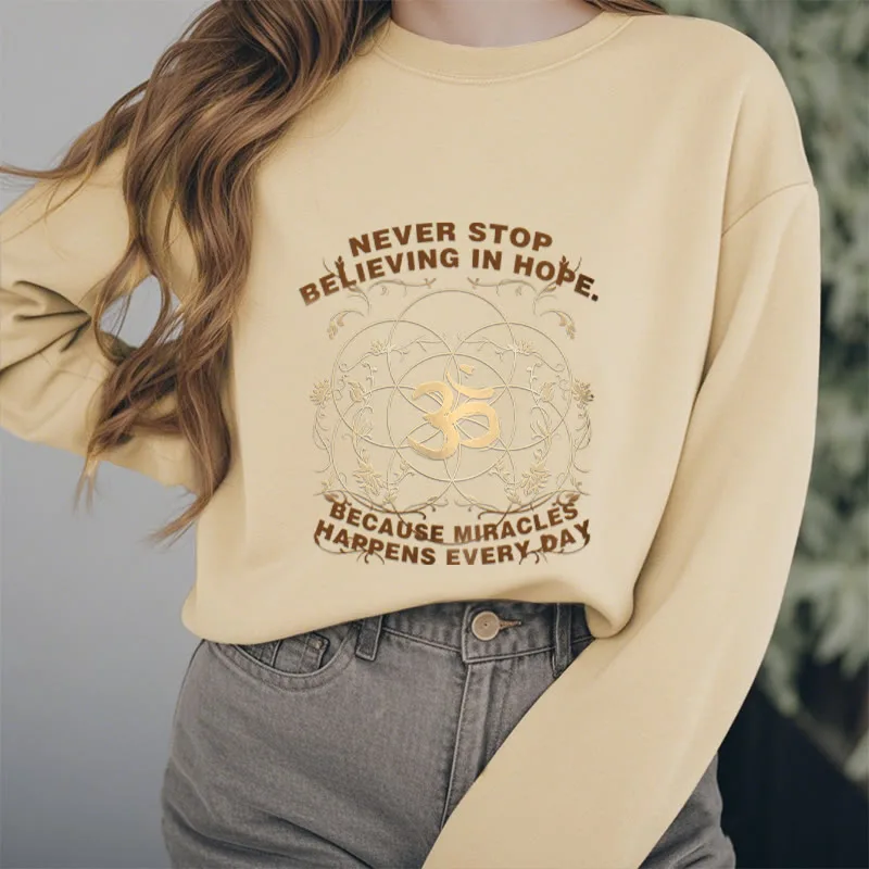 • DESIGN INSPIRATION: The sweatshirt featuring alotus flower. the OM symbol. and the phrase “Never stop believing in hope. Because miracles happen every day.”embodies themes of spiritual growth. positivity. and resilience. The lotus symbolizes purity and enlightenment. while the OM represents universal connection; together with the uplifting message. they encourage wearers to maintain faith in themselves and the transformative power of hope in their daily lives.