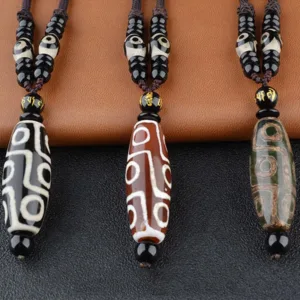 Dzi bead (Tib. ; pronounced “zee”; alternative spelling: gzi) is a type of stone bead of uncertain origin worn as part of a necklace and sometimes as a bracelet. Dzi beads are precious jewelry from Tibetan culture which is generally prized as protective amulets.these beads are believed to attract local protectors. dharmapalas or deities or maybe beneficial ghosts. ancestors or even bodhisattvas. Because of this. dzi beads are always treated with respect in Tibetan culture. Nine-Eye Dzi Bead is the symbol of The Nine Planets. It includes the activity of the Universe and the wisdom of the humanity. Nine-eyed beads is the most popular of all Dzis. brings all kinds of luck and blessings; protection. good health. purify negative energy expand intelligence and wisdom.It helps the investors with the successful development of new ideas in rolling in wealth.
