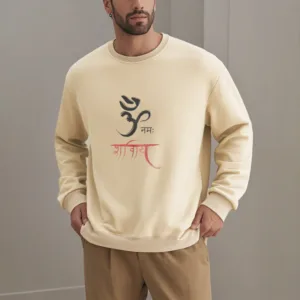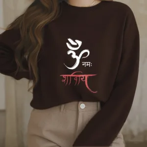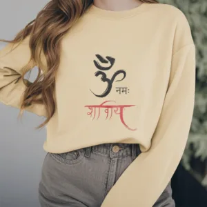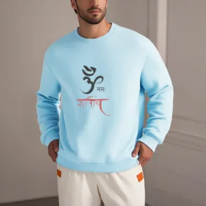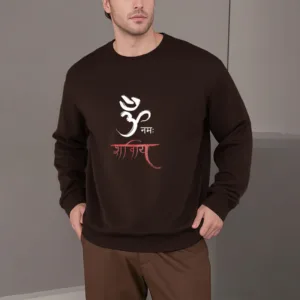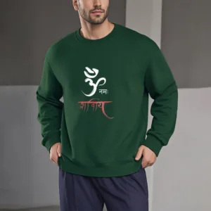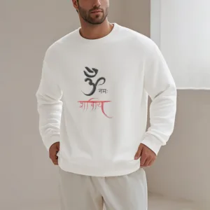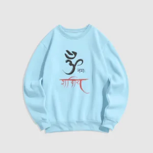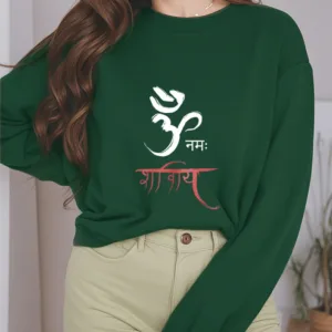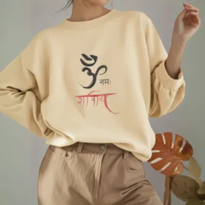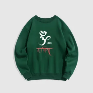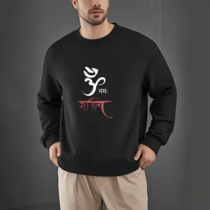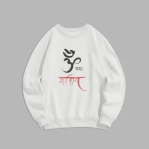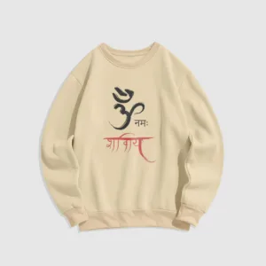 OM NAMAH SHIVAYA Polyester Sweatshirt is designed with a fleece lining for warmth and comfort. The Sanskrit mantra “OM NAMAH SHIVAYA” is prominently featured. symbolizing peace. devotion. and spiritual awakening. Made from durable polyester. this sweatshirt offers a cozy fit for those seeking relaxation or meditation. while connecting to spiritual practices.