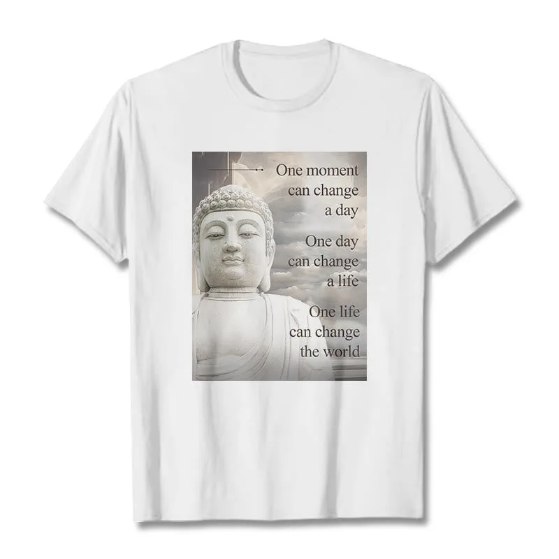 One Moment Can Change A Day T-shirt features an inspiring message with a serene Buddha design. symbolizing the power of mindfulness and positive change. Made from soft. high-quality fabric. this t-shirt encourages a mindful and present lifestyle. Perfect for daily wear. the uplifting graphic serves as a reminder that small moments can have a big impact.
