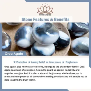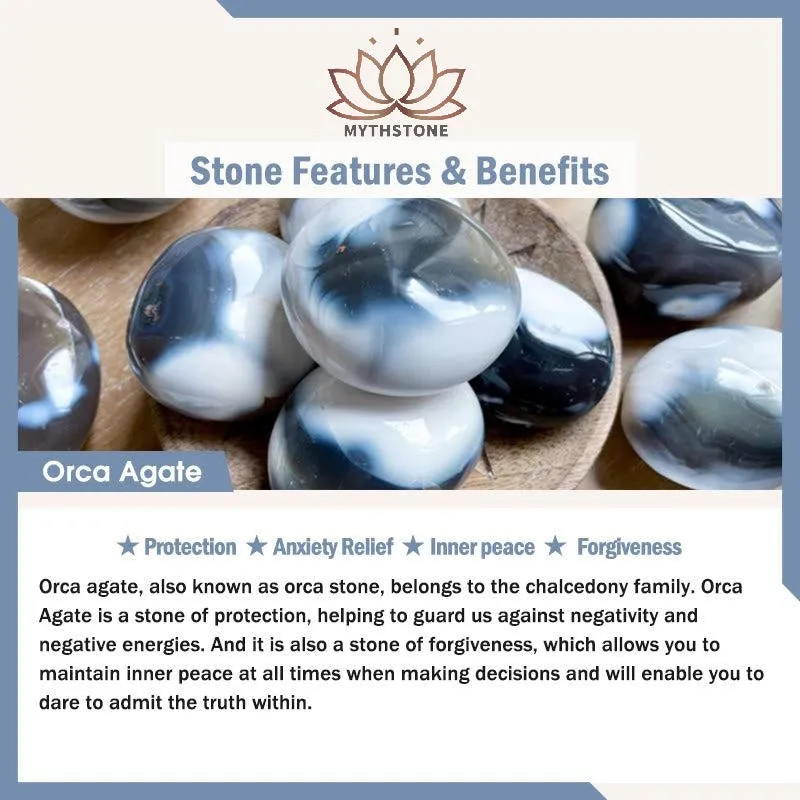 Orca agate. also known as orca stone. belongs to the chalcedony family. Orca Agate is a stone of protection. helping to guard us against negativity and negative energies. And it is also a stone of forgiveness. which allows you to maintain inner peace at all times when making decisions and will enable you to dare to admit the truth within.