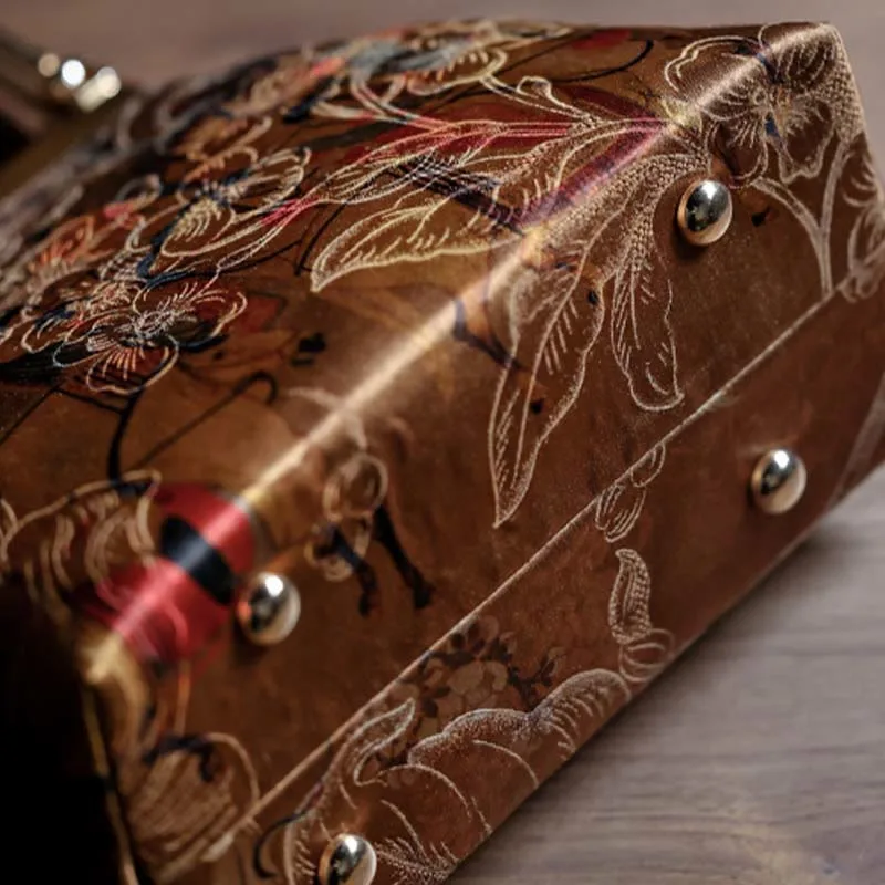 Painting of Lady of Guoguo on a Spring Outing handbag features an exquisite metal handle and a beautiful painting. This unique handbag captures the elegance and grace of traditional art. making it perfect for special occasions or daily use. The combination of classic artwork and modern design adds a touch of sophistication and cultural charm to your attire.
