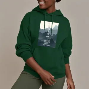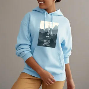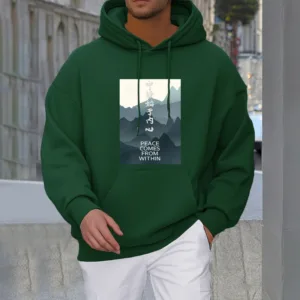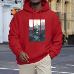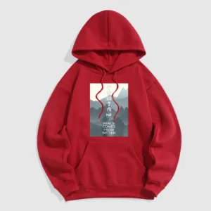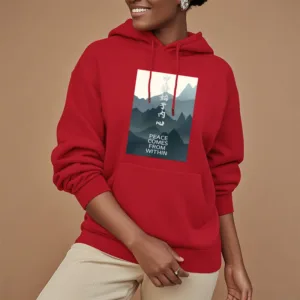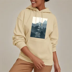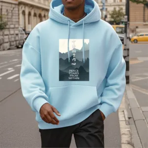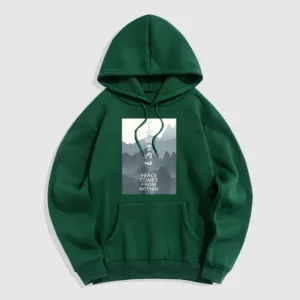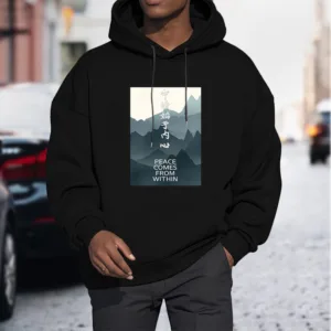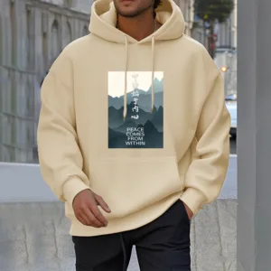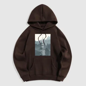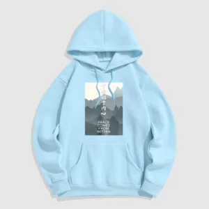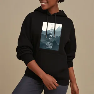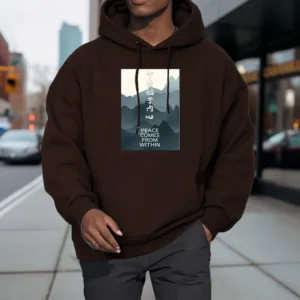 • DESIGN INSPIRATION: The hoodie featuring a mountain design along with the Chinese phrase “????ʼ??????” and the English phrase “Peace comes from within” symbolizes tranquility. strength. and the journey toward inner peace. The mountains represent stability and resilience. while the messages encourage wearers to seek calmness and balance from within. reminding them that true peace is cultivated internally.