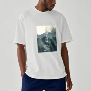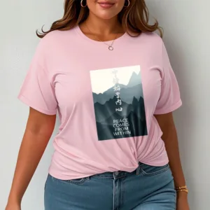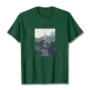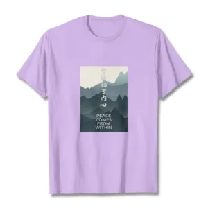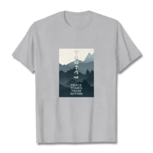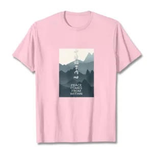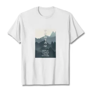 - DESIGN INSPIRATION: The T-shirt featuring a mountain design along with the Chinese phrase “????ʼ??????” and the English phrase “Peace comes from within” symbolizes tranquility. strength. and the journey toward inner peace. The mountains represent stability and resilience. while the messages encourage wearers to seek calmness and balance from within. reminding them that true peace is cultivated internally.