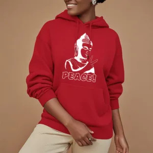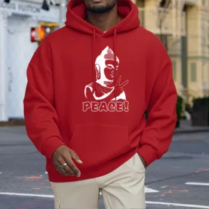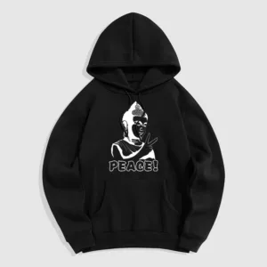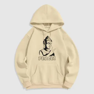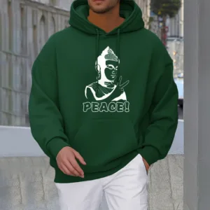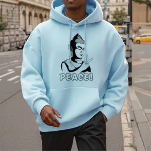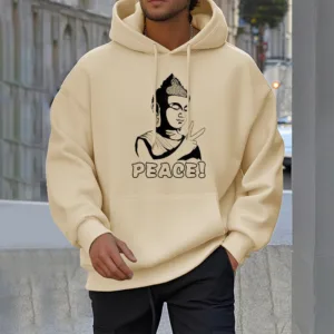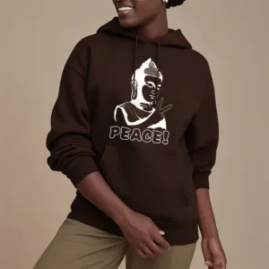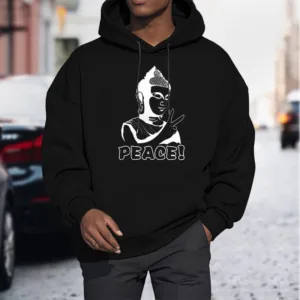 - DESIGN INSPIRATION: This hoodie features a Buddha symbol alongside the word “Peace.” representing tranquility. mindfulness. and the pursuit of inner harmony. Together. these elements convey a powerful message of serenity and the importance of cultivating peace in our lives.