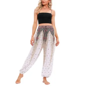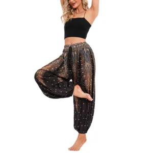 Peacock Feather Pattern Loose Harem trousers offer a blend of comfort and style. These yoga pants feature a striking peacock feather pattern. adding a touch of elegance. The loose fit and breathable fabric ensure unrestricted movement. while the elastic waistband provides a comfortable fit. Ideal for yoga or casual wear. these pants combine functionality and flair. making them a standout addition to your wardrobe.