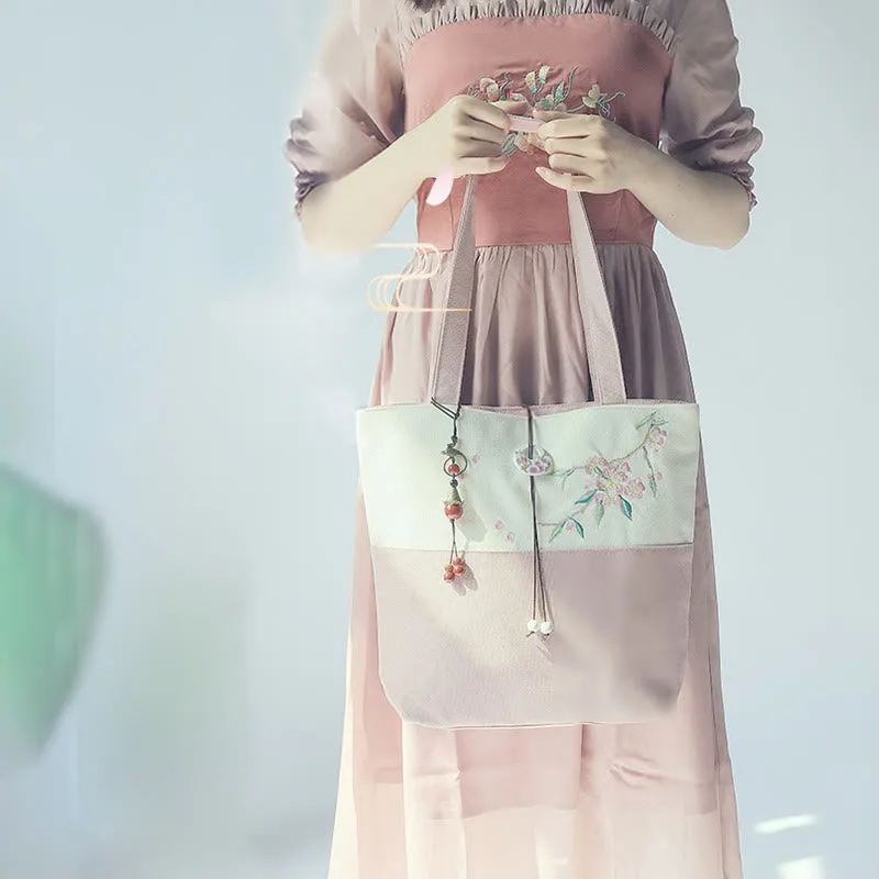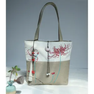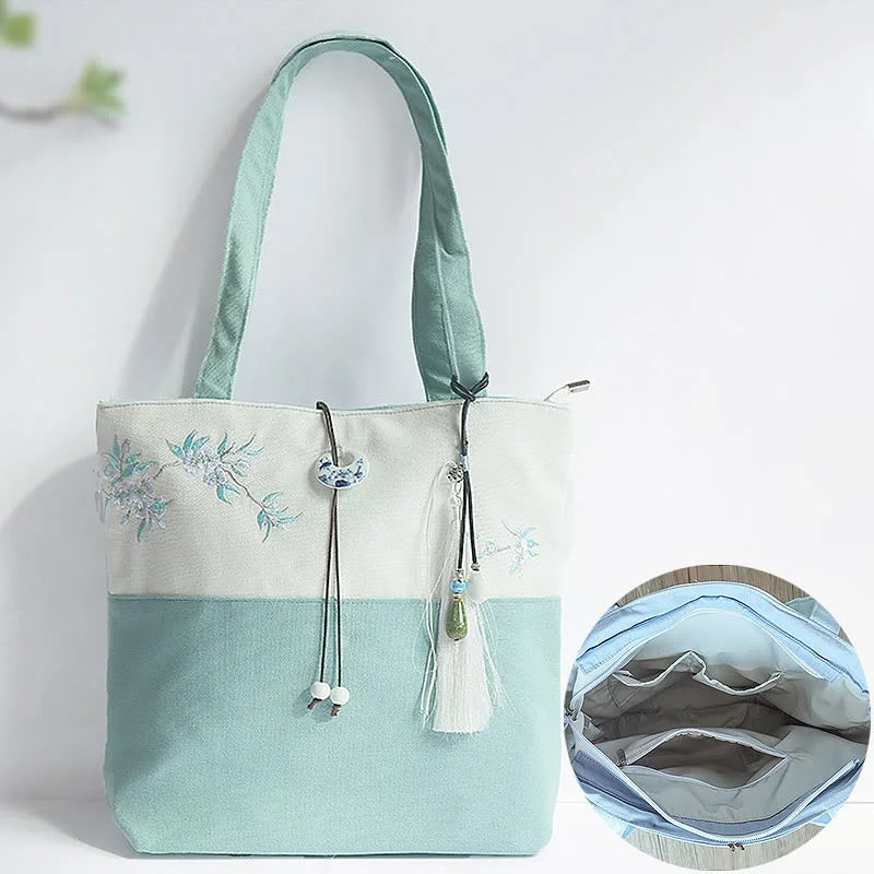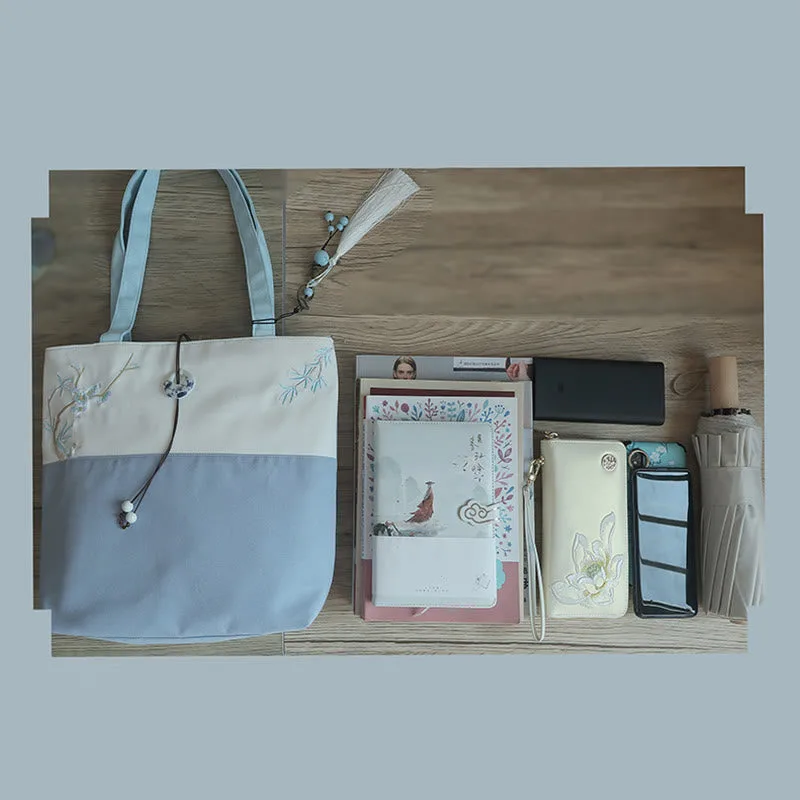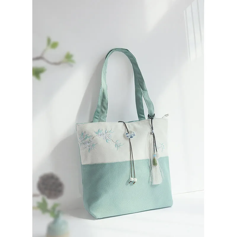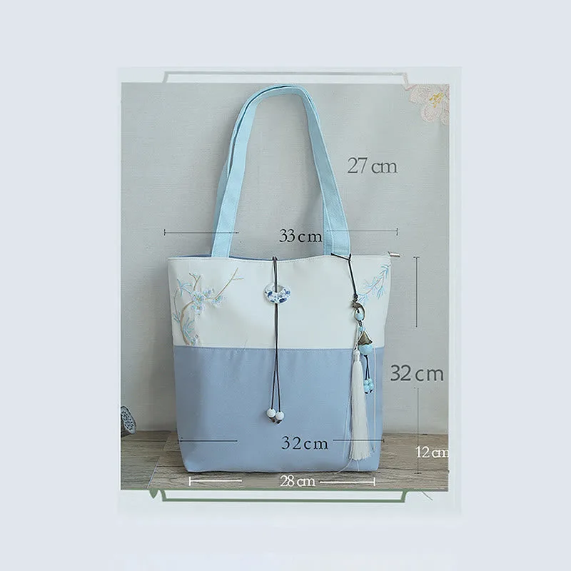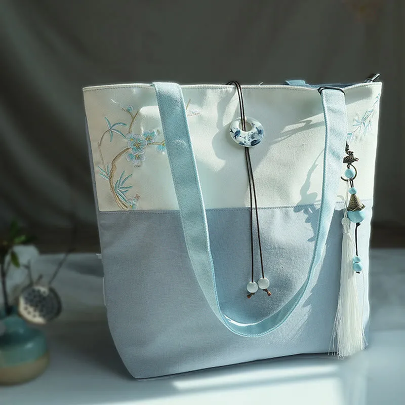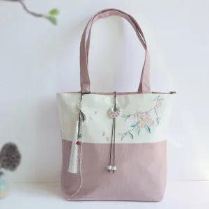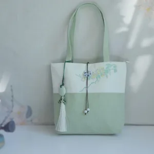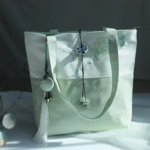 Experience the serenity of nature with our beautifully embroidered canvas tote bag. Featuring Mythstone. Pear Flowers. Plum Peach Blossoms. and Bamboo. this spacious shoulder bag is not only a testament to exquisite craftsmanship but also a practical choice for daily errands. Unite style and function in one elegant package.