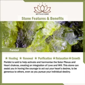 Peridot is said to help activate and harmonise the Solar Plexus and Heart chakras. creating an integration of Love and Will. This stone can assist you in having the courage to act out your heart’s desires. to be generous to others. even as you pursue your individual destiny.