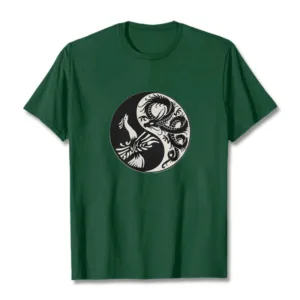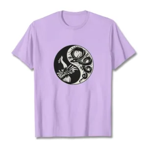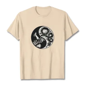 Phoenix Yin Yang Cotton Tee T-shirt features a dynamic Yin Yang design. The Yang side is adorned with a dragon. symbolizing strength. while the Yin side showcases a phoenix. representing rebirth. Made from soft cotton. this T-shirt embodies harmony. balance. and the interplay of opposites. Its intricate artwork carries profound spiritual significance. making it a meaningful choice for personal expression.
