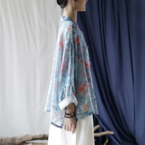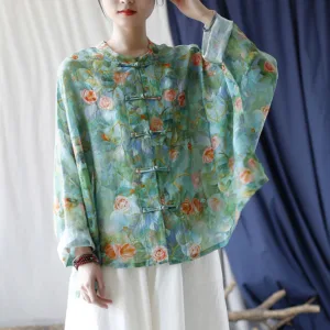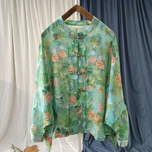 Be the first to review “Mythstone Pink Flowers Green Leaves Print Frog-button Design Long Sleeve Ramie Linen Jacket Shirt”