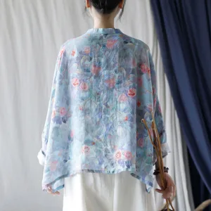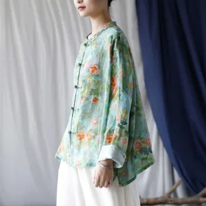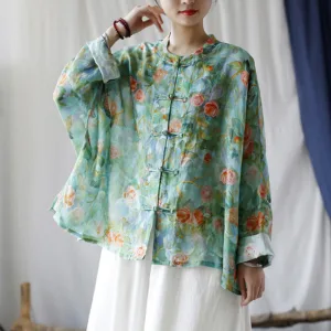 Mythstone Pink Flowers Green Leaves Print Frog-button Design Long Sleeve Ramie Linen Jacket Shirt